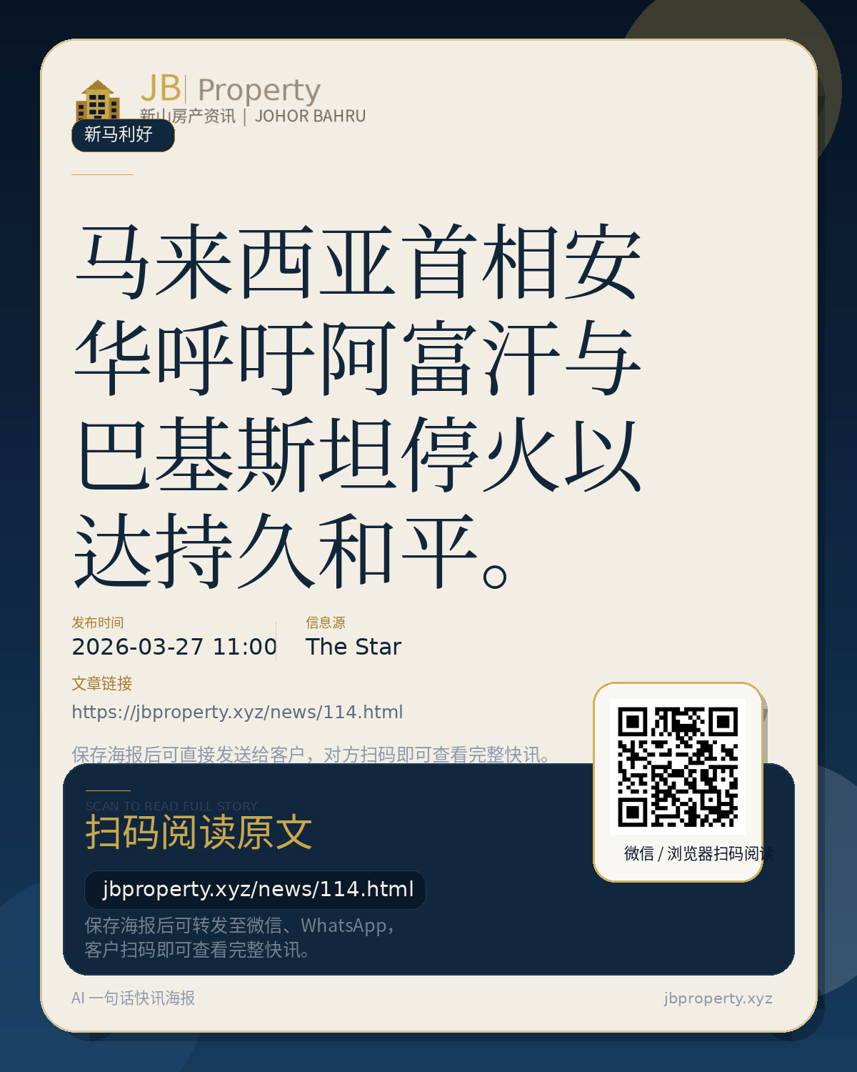 马来西亚首相安华呼吁阿富汗与巴基斯坦停火以达持久和平。