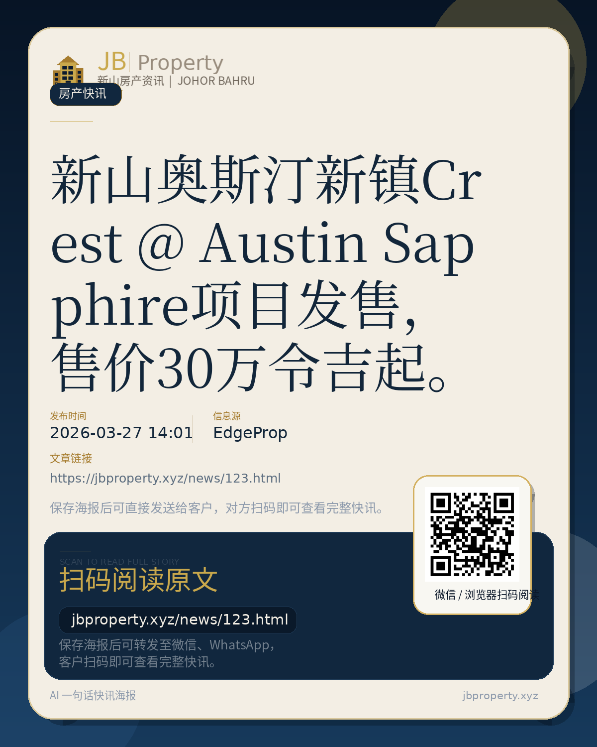 新山奥斯汀新镇Crest @ Austin Sapphire项目发售,售价30万令吉起。