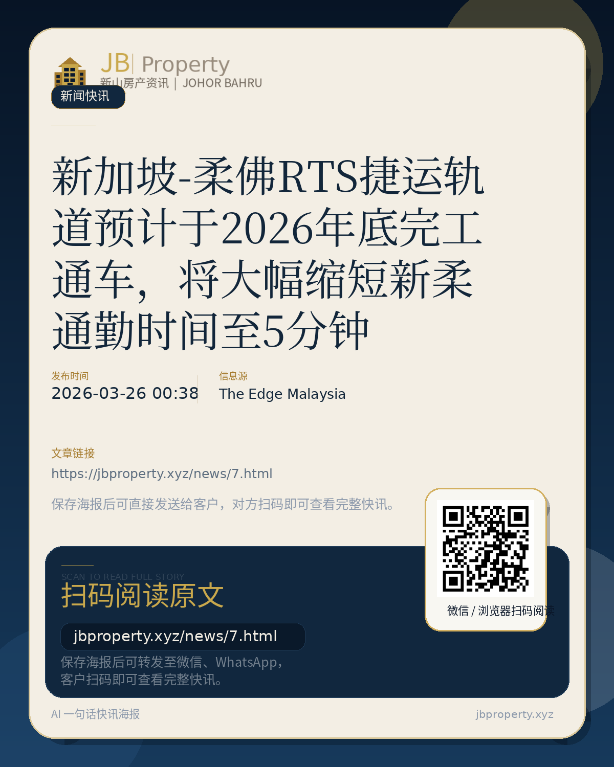 新加坡-柔佛RTS捷运轨道预计于2026年底完工通车,将大幅缩短新柔通勤时间至5分钟