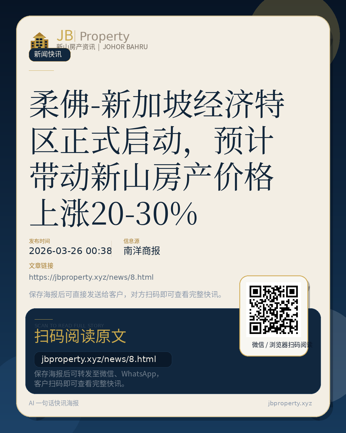 柔佛-新加坡经济特区正式启动,预计带动新山房产价格上涨20-30%